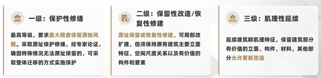 到2024年12月,上海印发了《上海历史风貌保护指南》,首次在官方文件中明确提出对“风貌建筑”按照一级、二级、三级进行分级管理。对不同等级的风貌建筑需要怎么保护、怎么修缮、怎么使用,都进行了明确划定。大家可以看一下,我们根据《上海历史风貌保护指南》的内容做了一个表格。