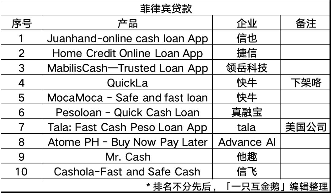 「一只互金鹅」总结了一些常见的菲律宾在线贷款产品——
