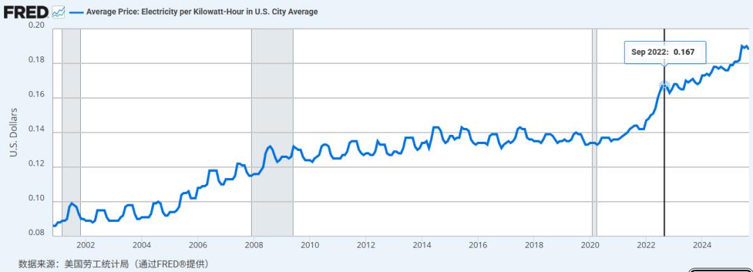 从美国劳工统计局的统计图就能看出来,2021 到 2022 电费飙升。训练 GPT 的同时,正常居民用电已经被挤兑了。