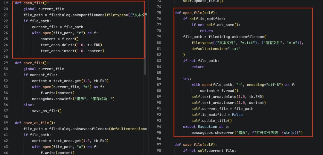 具体到某个函数,比如打开文件夹模块,左边旧代码中文内容乱码,没有进行文件不存在的异常处理,新代码都进行了改善。