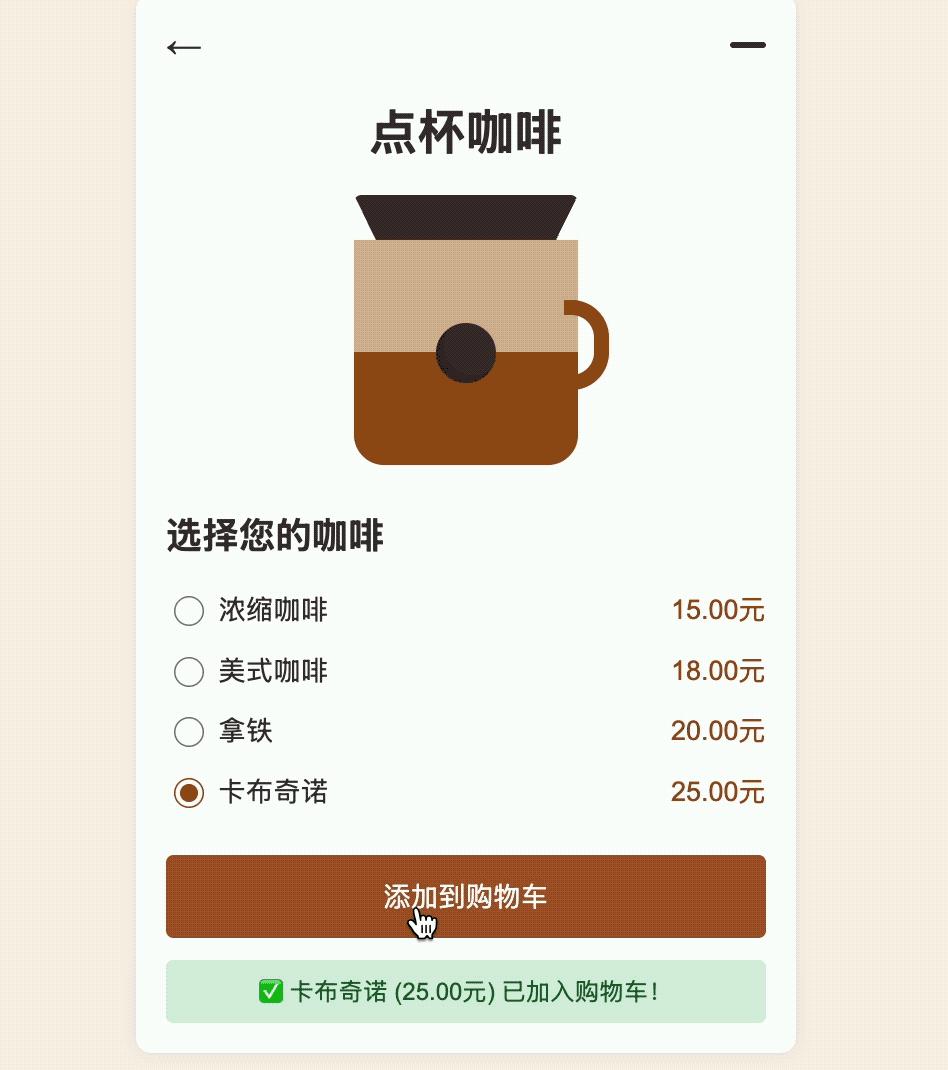 (提供UI设计稿)请参考给出的UI设计稿图片,生成一个“移动端咖啡点单页面”,生成满足所有要求的前端代码,确保页面主题明确。