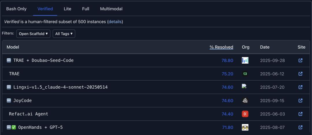第一,性能SOTA,与TRAE开发环境深度结合后,能更快、更准地解决问题,登顶了SWE-Bench Verified榜单。