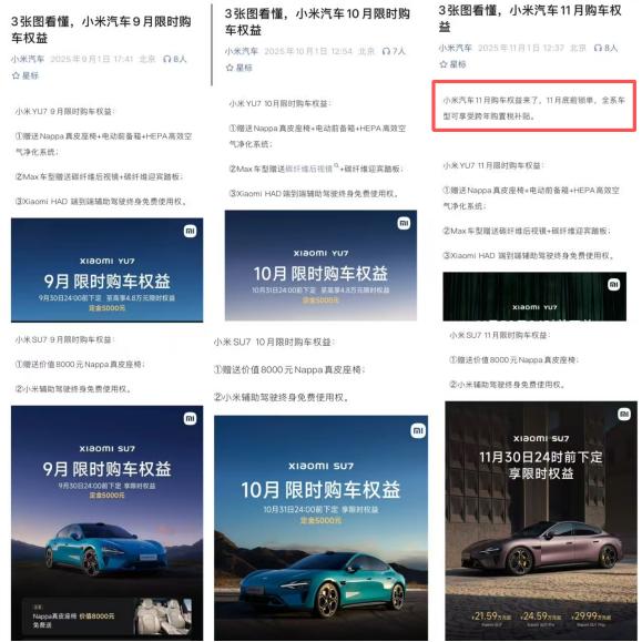 小米汽车9月、10月、11月购车权益,图源:小米汽车微信号