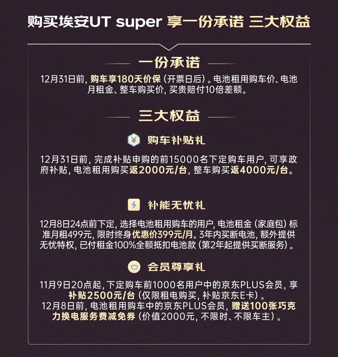 4.99万元!京东联合广汽集团、宁德时代正式公布了“国民好车”埃安UT super的售价,租用电池购车价只要4.99万元,整车购买价为8.99万元,远低于市场猜测价格,直接将A级轿车的价格杀穿。
