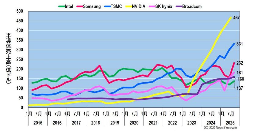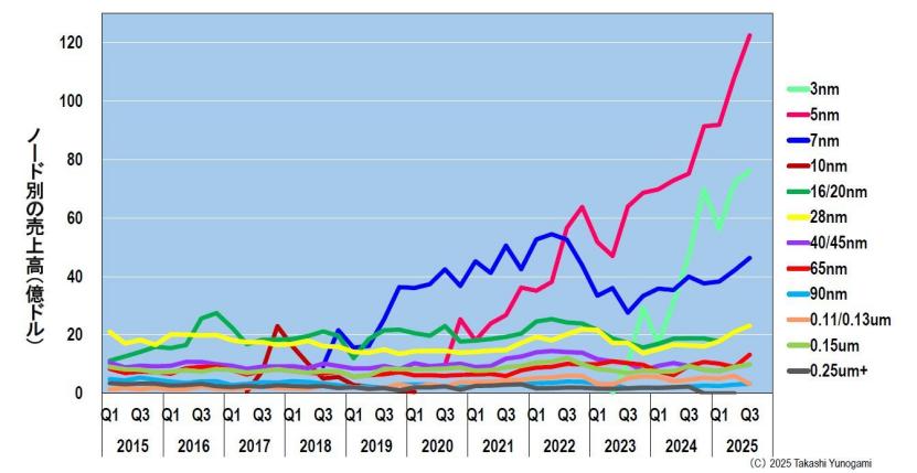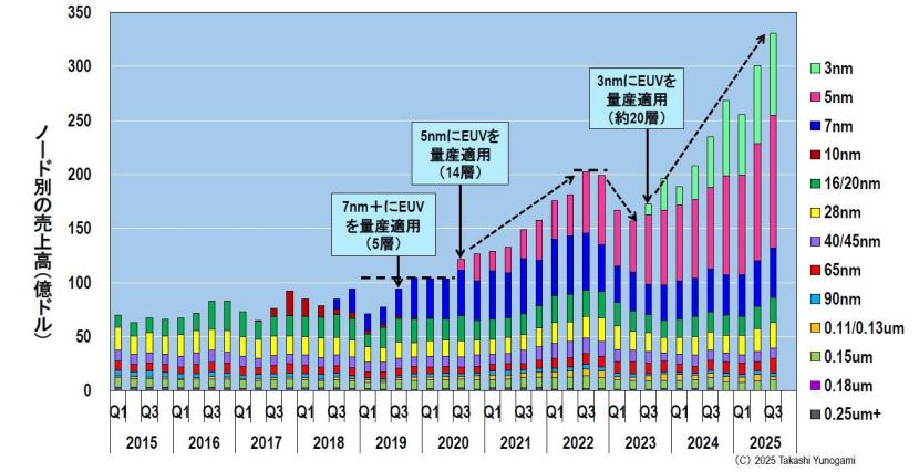 然而,自2022年第四季度起,受新冠疫情导致半导体行业衰退的影响,台积电的销售额暂时下滑。但随着2023年第三季度采用约20层EUV光刻技术的3nm工艺的推出,销售额开始回升,并如前所述,在2025年第三季度达到创纪录的331亿美元。