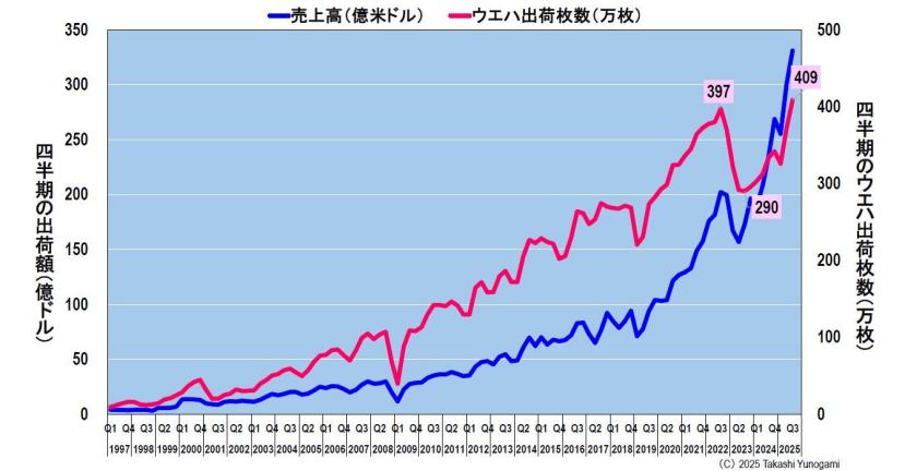 图 3:季度出货额和晶圆出货量(截至 2025 年第三季度)