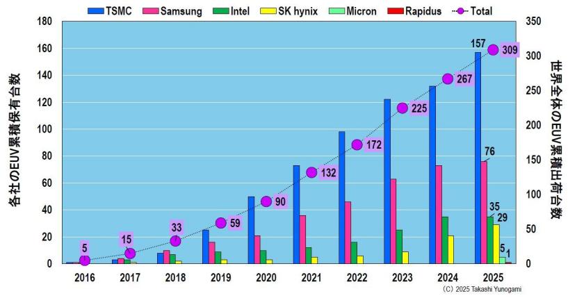具体细分如下:台积电 157 台(50.8%),三星 76 台(24.6%),英特尔 35 台(11.3%),SK 海力士 29 台(9.4%),美光 5 台(1.6%),Rapidus 1 台(0.3%)。