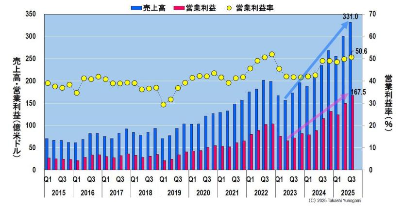 根据台积电于10月16日公布的2025年第三季度财务业绩,销售额达到331亿美元,营业利润达到167.5亿美元,均创历史新高。此前一度跌至40%左右的营业利润率也已回升至50%以上(见图1)。