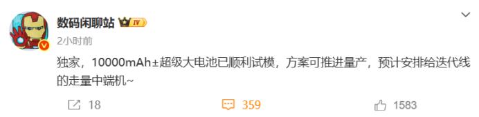 11月11日,据博主@数码闲聊爆料,某厂商的10000mAh±超级大电池已顺利试模,方案可推进量产。