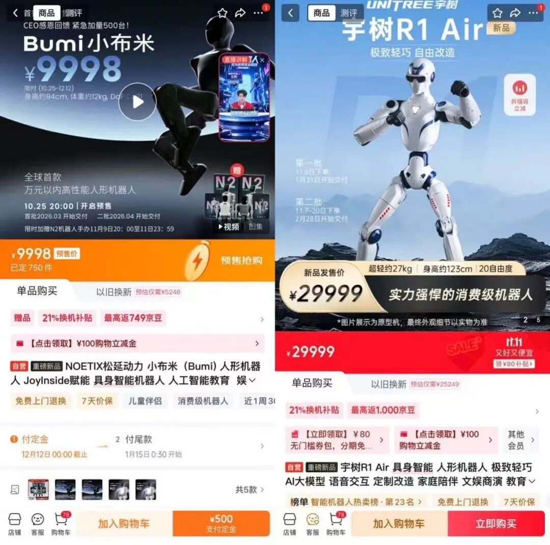 京东数据显示,“双11”启动后的首周,智能机器人成交额同比增长5倍;天猫平台上的weilan、云深处、优必选等智能机器人品牌均实现双位数以上增长。不仅是电商平台,10月以来,1.26亿元、2.6亿元、6.3亿元等采购金额一次次出现在各家人形机器人公司的公告中。行业开始用实实在在的订单,证明其商用落地的速度。