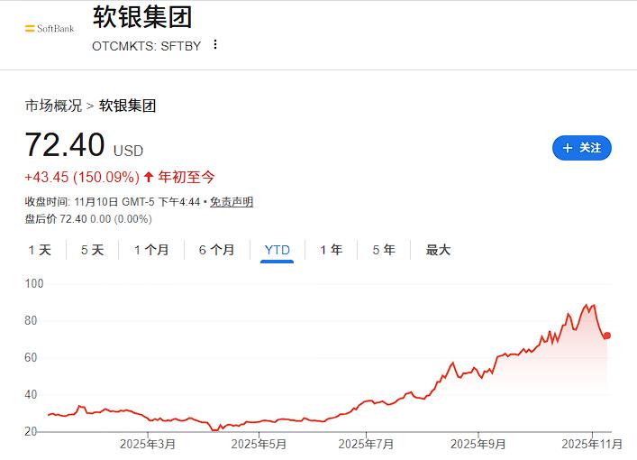 不过,软银股价在过去一周大幅下挫,市值蒸发近500亿美元,创下自2020年3月以来最差单周表现。全球市场对AI泡沫的担忧是此轮抛售的主要驱动因素。软银股价今年迄今仍累计上涨超过150%。