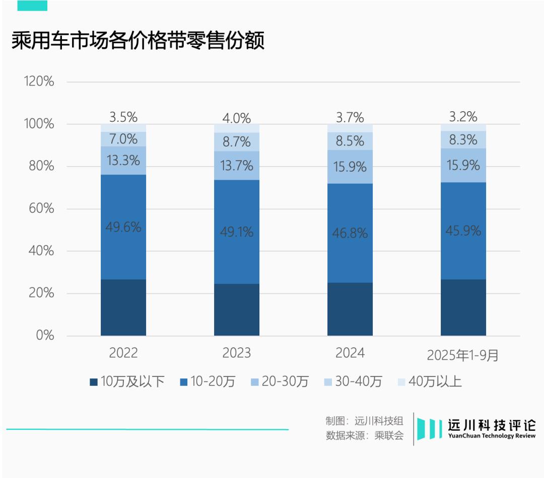 新能源车在大众市场势如破竹,但30万以上的高端价格带,一直是新能源车久攻不下的斯大林格勒。上探到40万以上的区间,依然是燃油车铁打的舒适区。