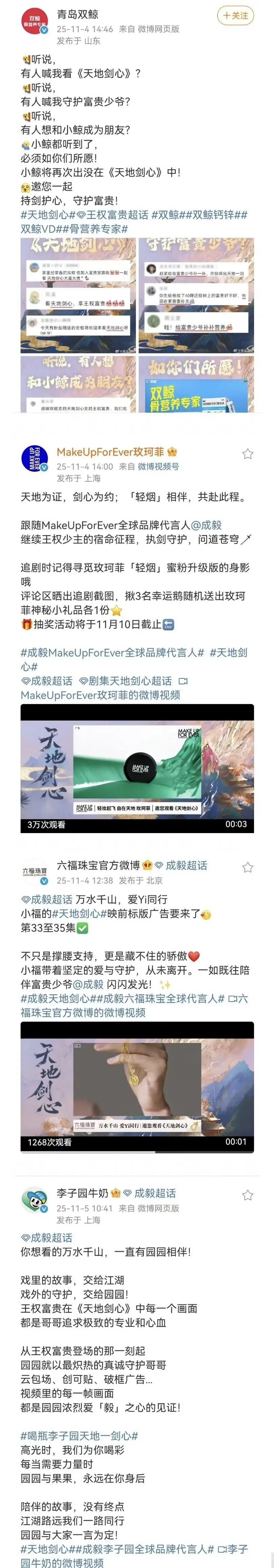在《天地剑心》中,成毅自带的品牌合作占到了剧集广告投放的三分之一以上,显示了其个人品牌的巨大商业潜力。成毅的粉丝群体也积极支持剧集及其相关商务,形成了强大的市场推动力。在《天地剑心》中的广告投放中,丝塔芙、玫珂菲、李子园、芭妮兰、六福珠宝、青岛双鲸等品牌均为成毅的代言品牌,这不仅增强了剧集的广告效应,也展示了明星个人影响力在影视剧招商中的独特价值。