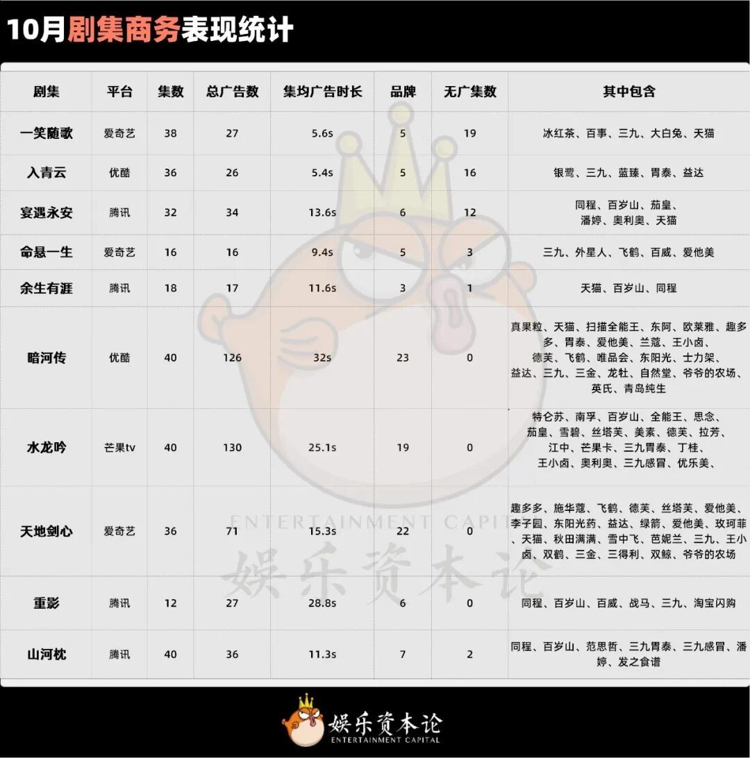 《暗河传》是四部古偶作品中招商效果最为突出的剧集,但与上半年那些古偶头部作品相比,仍有一定差距。例如,《折腰》共计投放了167个广告,《藏海传》达到了218个广告,《锦绣芳华》也有216个广告,而《暗河传》开局7个广告,总体广告数达到126个,集均广告时长达32秒,已是10月广告投放最为密集的剧集之一。