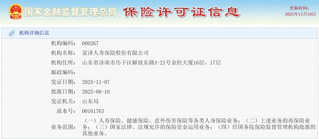 11月10日,国家金融监督管理总局官网显示,富泽人寿保险股份有限公司(下称“富泽人寿”)于今年6月10日正式获批保险许可证。