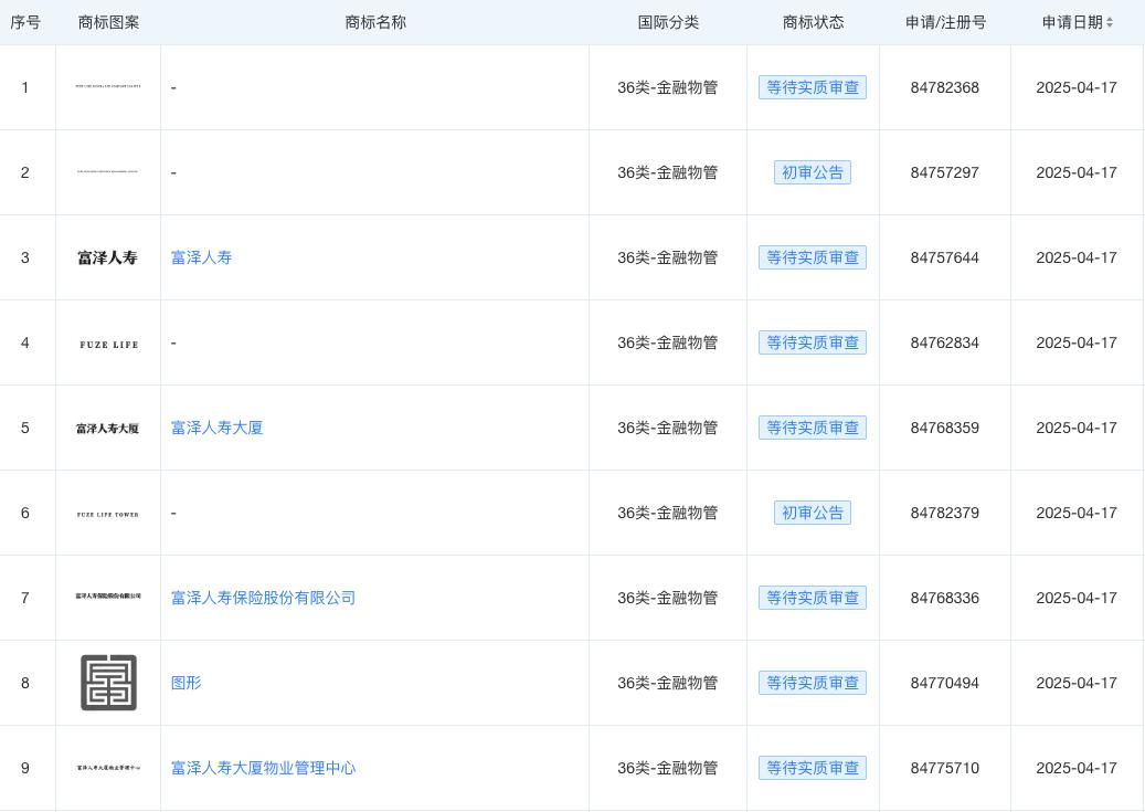 商标信息显示,今年4月,君康人寿作为申请人已经递交了多个“富泽人寿”的商标注册申请,包括“富泽人寿大厦”“富泽人寿保险有限公司”以及富泽人寿的logo等。