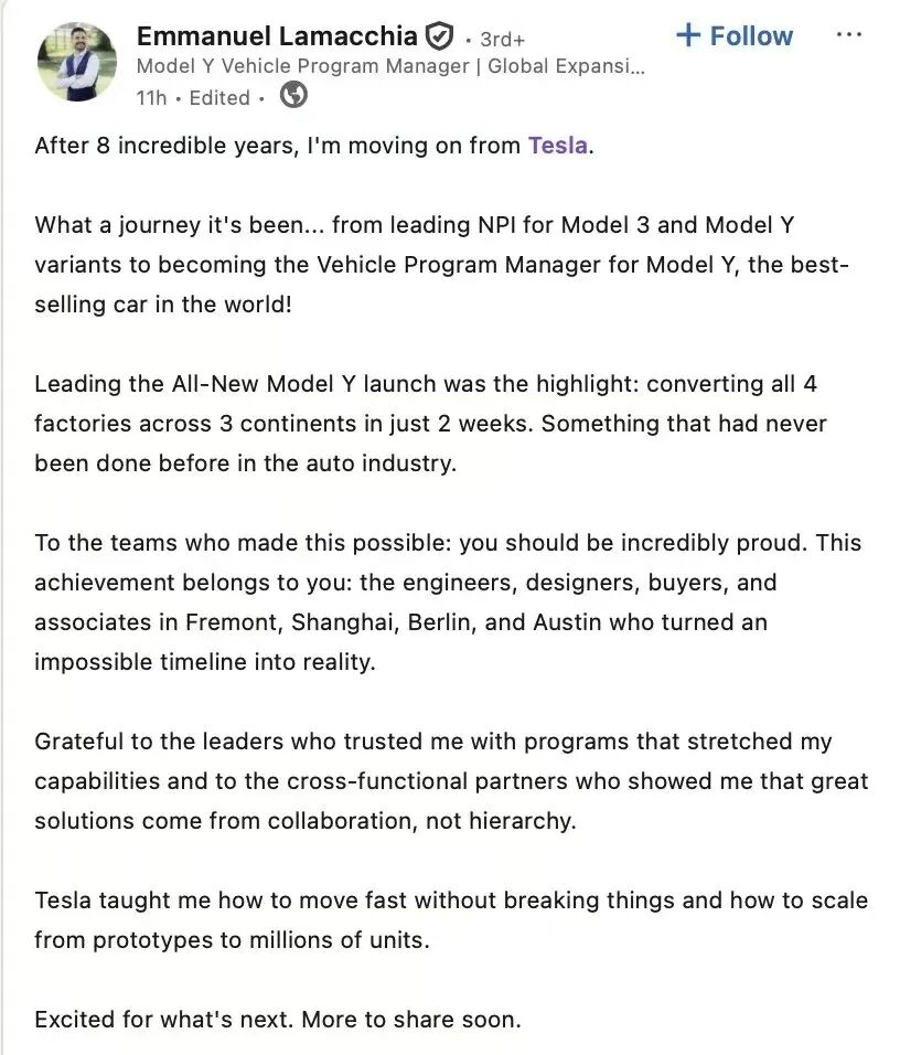 和阿瓦斯蒂一样,拉马奇亚也在其领英上与特斯拉告别,他写道:“这是一段多么美好的旅程......从领导Model 3和Model Y的新产品导入(NPI),到成为全球最畅销汽车Model Y的汽车项目负责人。"
