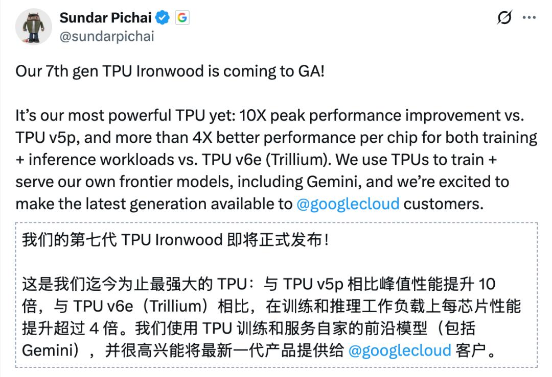这几天,谷歌终于把憋了很久的大招放出来了,CEO劈柴官宣了自研第七代TPU Ironwood正式商用。
