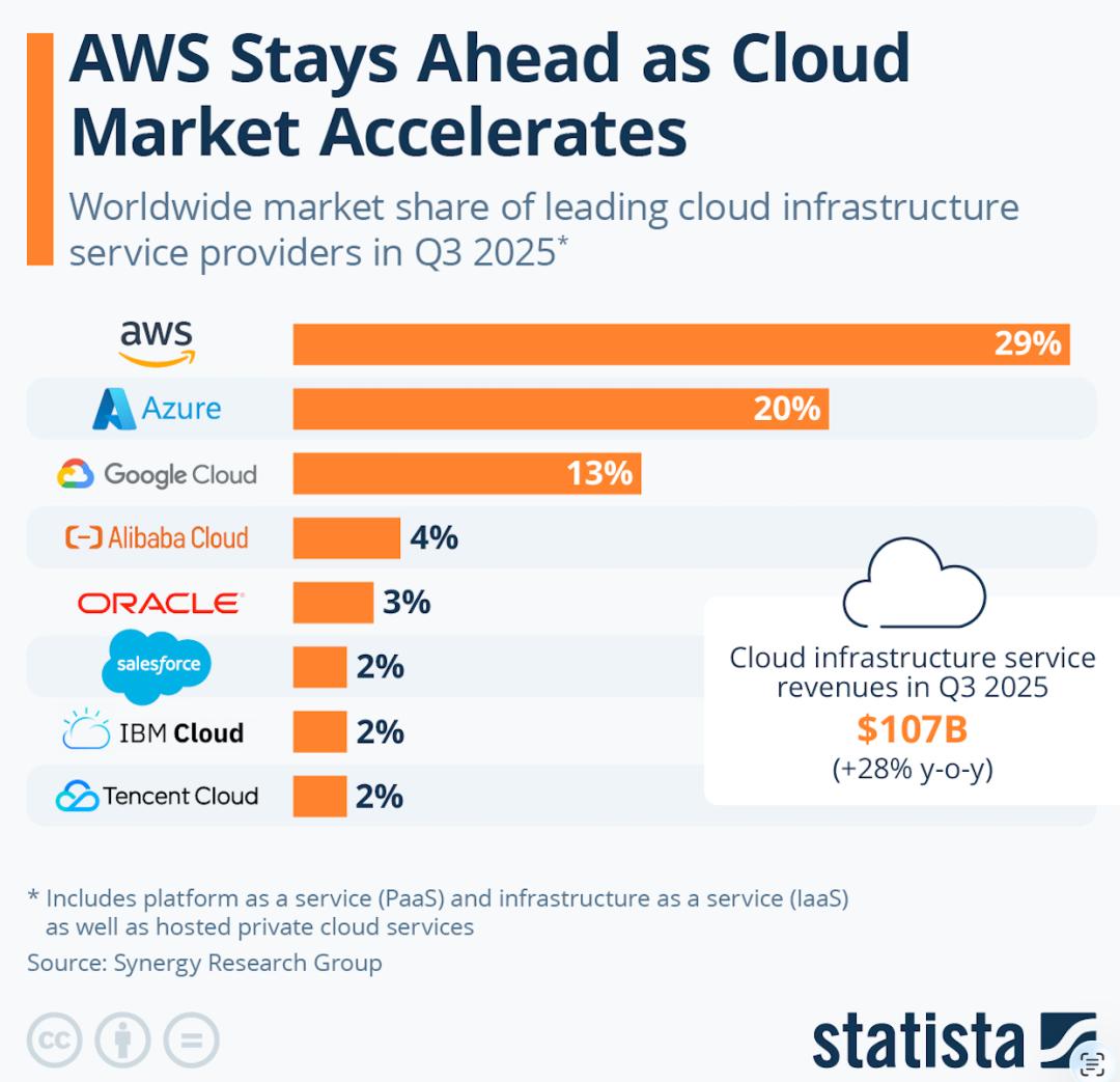 谷歌的云服务在2025年3季度处于世界第3,前面是亚马逊和微软。