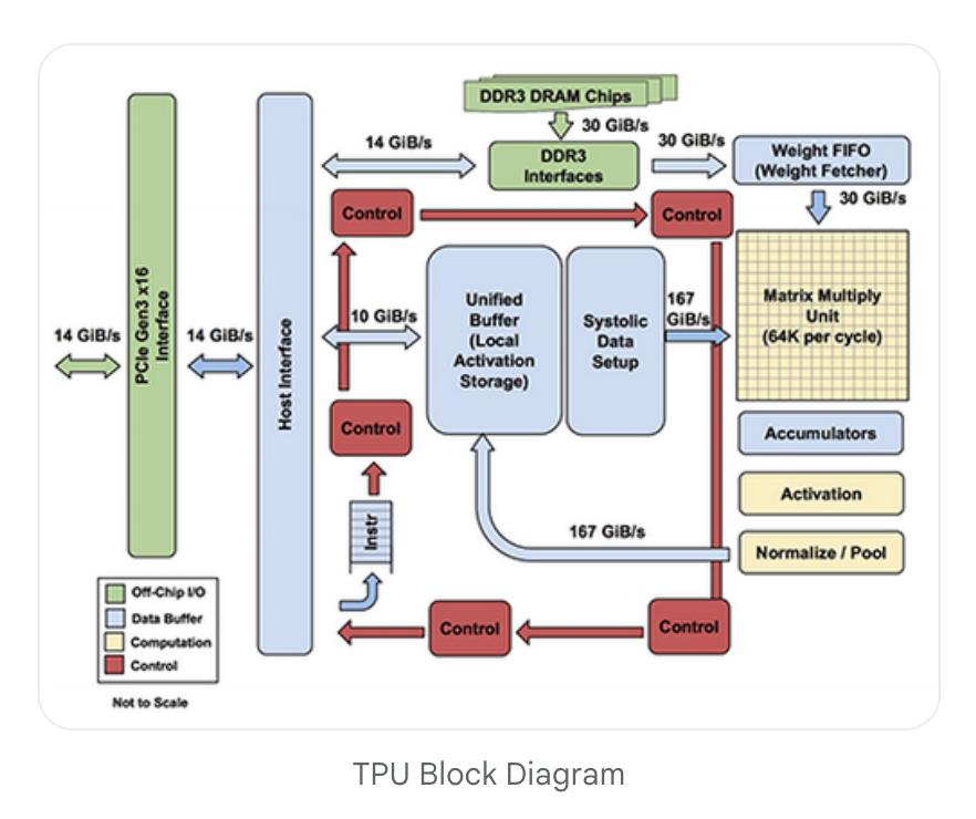 与CPU(通用处理器)和GPU(当时主要为图形渲染优化)不同,TPU彻底摒弃了非必需的硬件,如缓存、乱序执行和纹理映射单元。