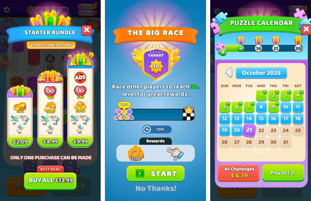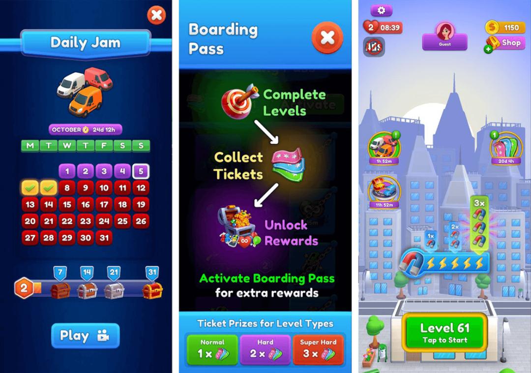 此外,《Coin Sort》积极引入事件活动:每日挑战、竞速活动贯穿玩法周期。这类活动如今已成为混合休闲领域的主流趋势,超过60%的产品采用该机制。