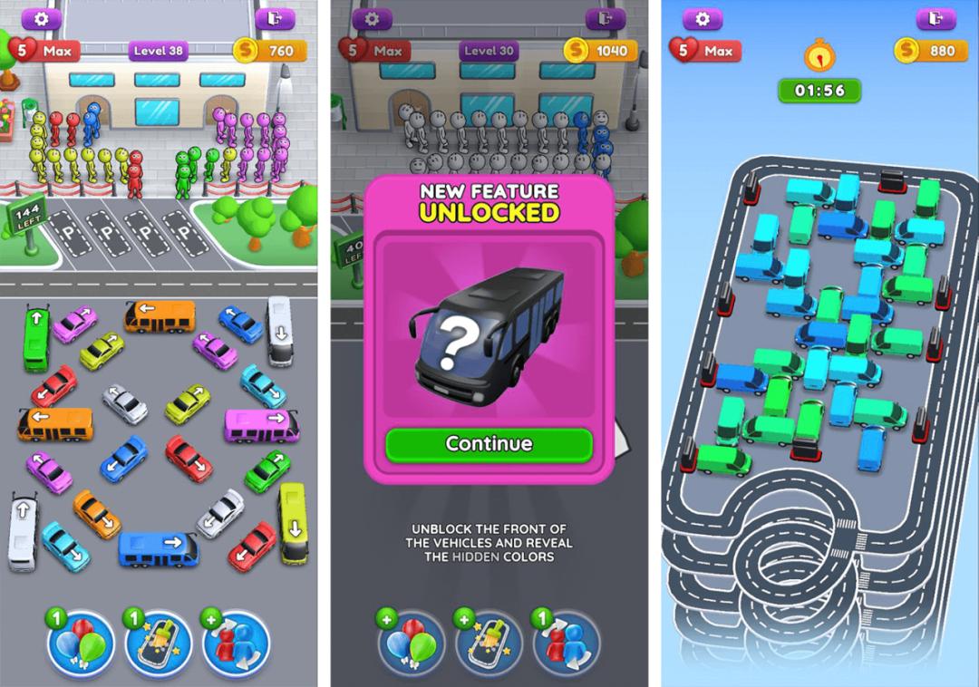 玩法上,它巧妙结合了「停车」与「分类」机制——玩家需要移动车辆、疏通交通、让乘客登上匹配颜色的车。灵感显然来自经典《Parking Jam 3D》,但Rollic通过更平滑的难度曲线与阶段性功能解锁,让循环更耐玩。