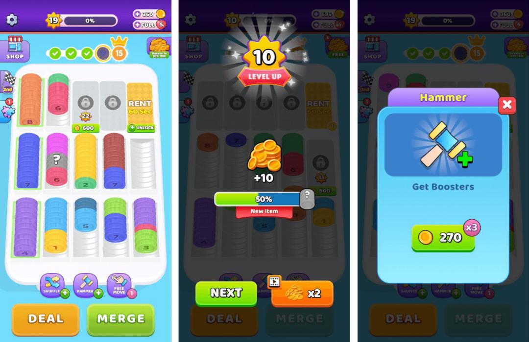 玩法上,玩家通过点击「发牌」按钮获得随机硬币组合,并进行归类合并。它融合了「合成+无尽循环」结构,类似《2048》的逐步升级感,又继承了早年「Water Sort」类游戏的节奏流畅性。