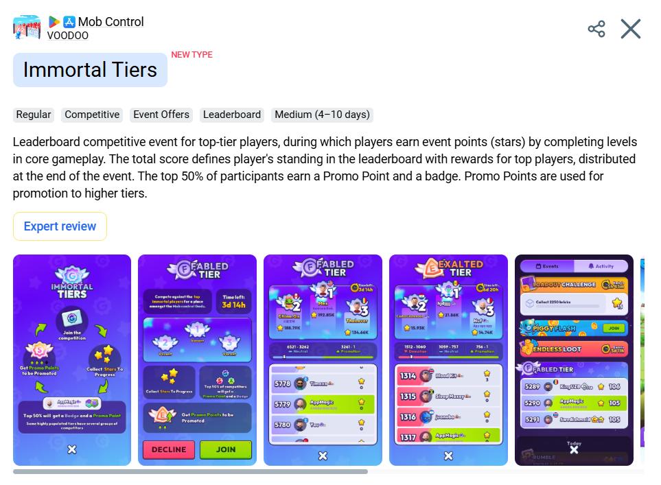 作为2021年的老将,《Mob Control》依然保持活跃,季度收入环比增长7%。其在6月引入的「Immortal Tiers」活动成为常设机制,将排行榜与核心循环紧密挂钩。游戏的变现能力依旧是其最大强项出色——其付费率和长期收益稳定。