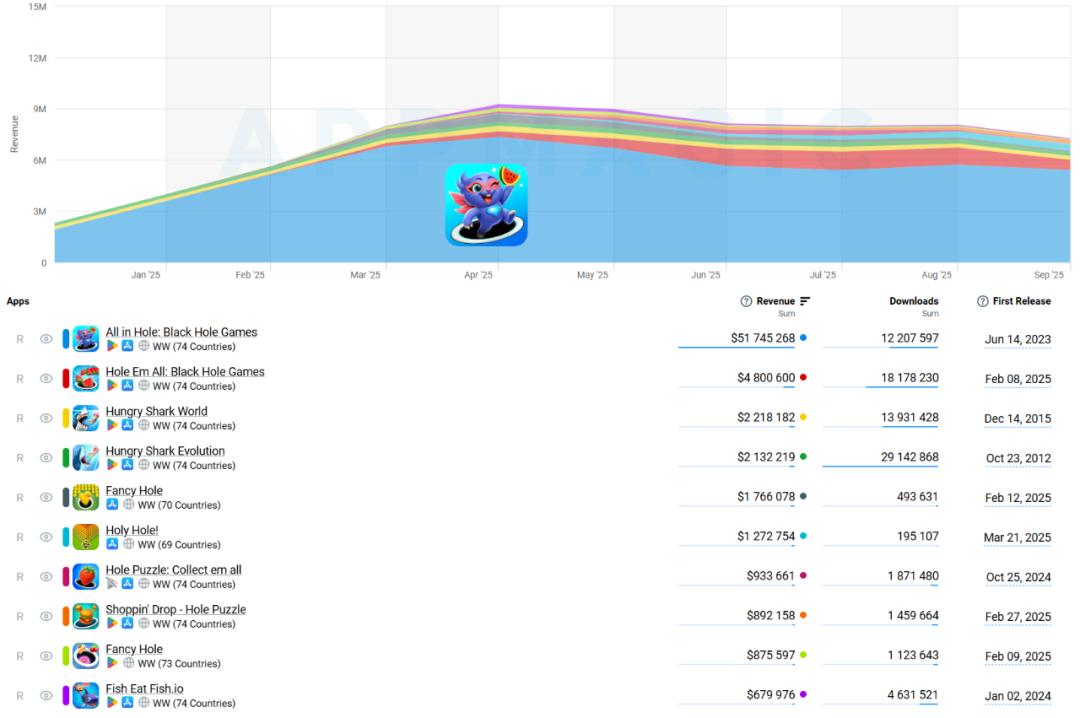 Homa的代表作在「Eat & Grow」细分品类中持续领跑。其IAP优先的模型表现突出,7月上线的「Treasure Pass」进一步强化了付费体系。即便竞争者《Hole Em All》在下载量上超越它,但在收入层面仍难撼动其地位。