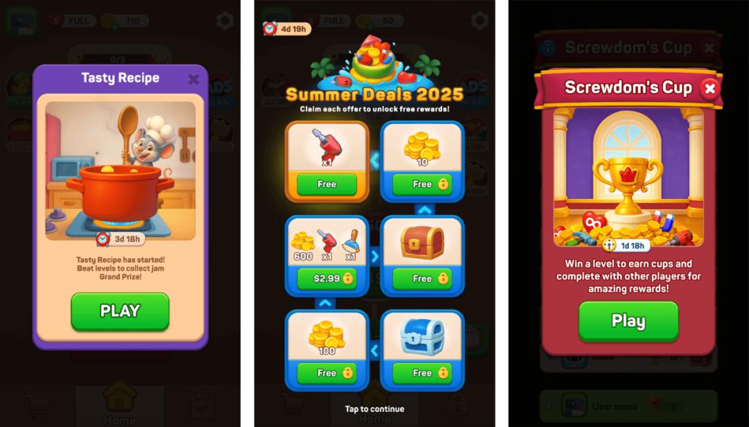 8月新增「Tasty Recipe」活动,9月又上线了「Screwdom's Cup」和「Basketball League」,推动月收入飙升15%。
