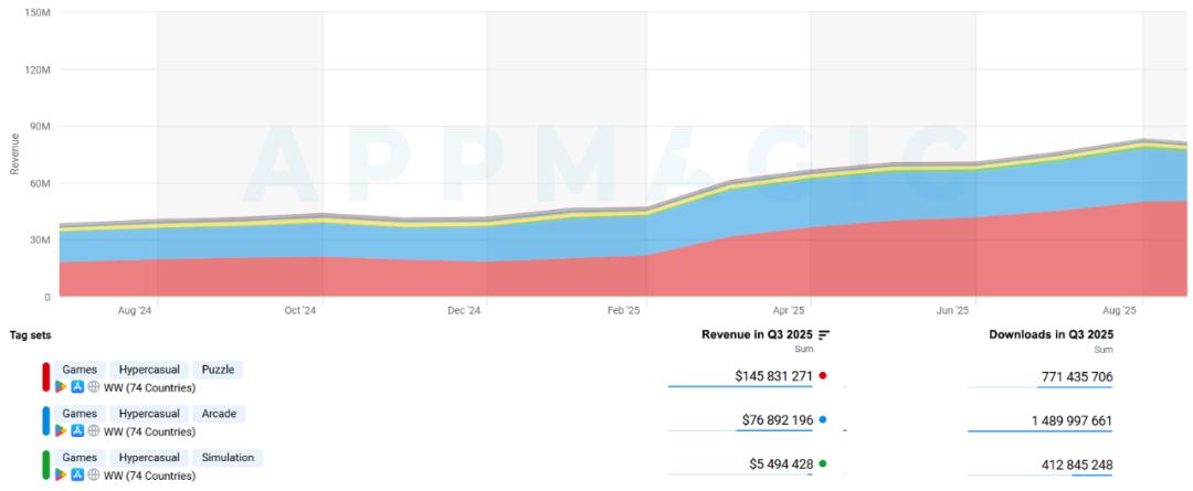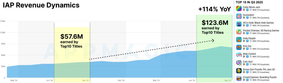 AppMagic近期就发布了《2025年Q3混合休闲游戏Top 10》——从收入榜中过滤出「超休闲」标签的高收入游戏,更清晰地捕捉到那些通过IAP实现营收、真正跨入混合领域的产品。