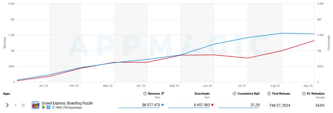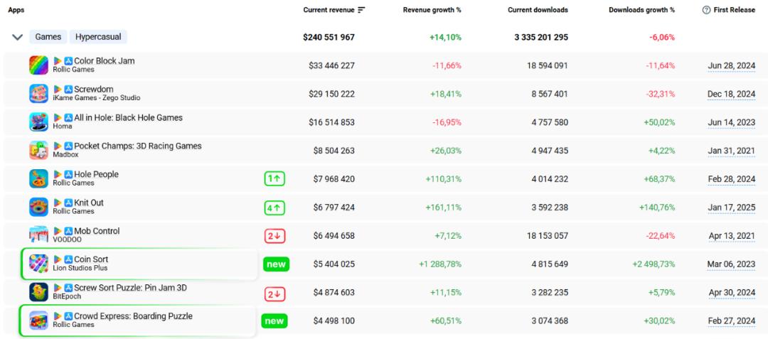 Rollic继续巩固其在混合休闲领域的主导地位,本季度前十中有四款来自他们的作品。《Crowd Express》自2024年底全球上线后,收入稳步增长,终于挤入榜单。