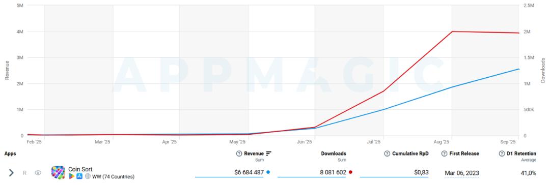 这款「硬币分类」题材的益智游戏成为第三季度的最大黑马——三个月内月收入暴涨九倍。游戏由Lion Studios发行,该工作室也是《Match 3D》《Hexa Sort》等热门休闲游戏的幕后团队。