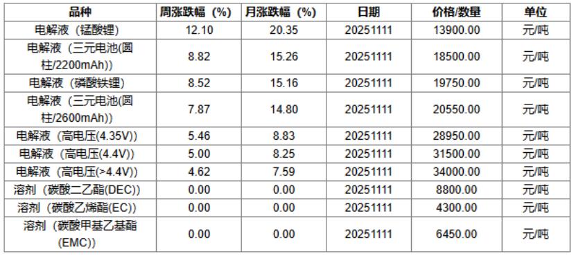 在下游,六氟磷酸锂的供应紧张直接传导至电解液环节。11月11日,锰酸锂电解液最新报价13900元/吨,一周上涨了12.1%,月涨幅更高达20.35%(详见下图)。
