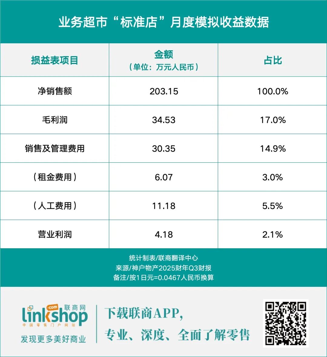 根据标准店的模拟收益数据,月销售额约为203万,毛利率为17%。在扣除约30万销售与管理费用后,月营业利润约为4.2万。而神户物产上一财年7%的营业利润率则表明,其实际运营的单店年营业利润很可能高于此模拟推算值。