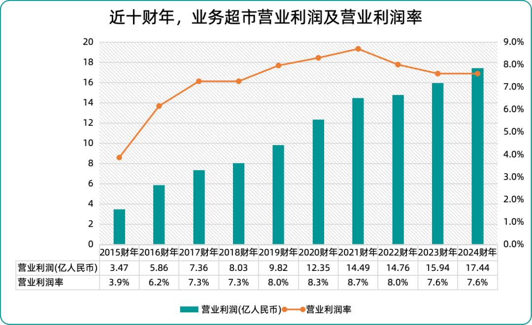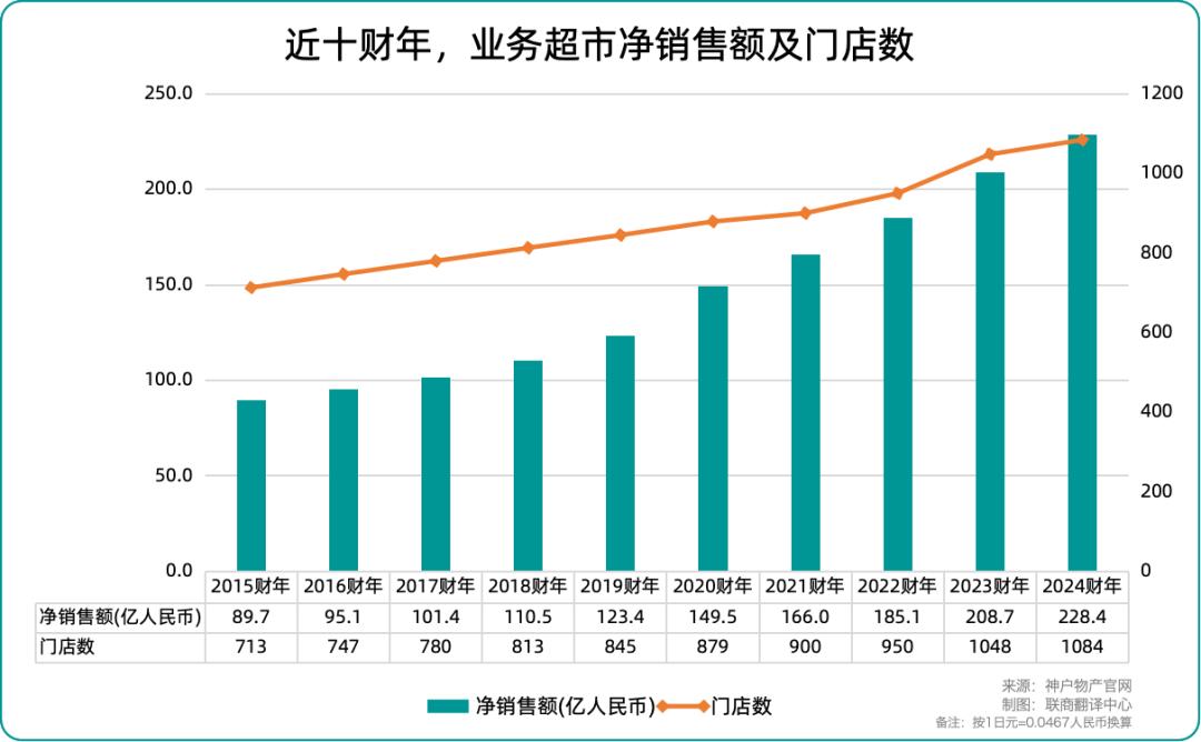 联商网统计发现,在2015-2024财年间,业务超市净销售额累计增长154.7%,年均复合增长率约为10.9%,且增长势头依旧强劲,占神户物产总销售额的90%以上;门店总数从713家增长至1084家,十年净增371家,年均新增约37家门店,扩张节奏稳健。
