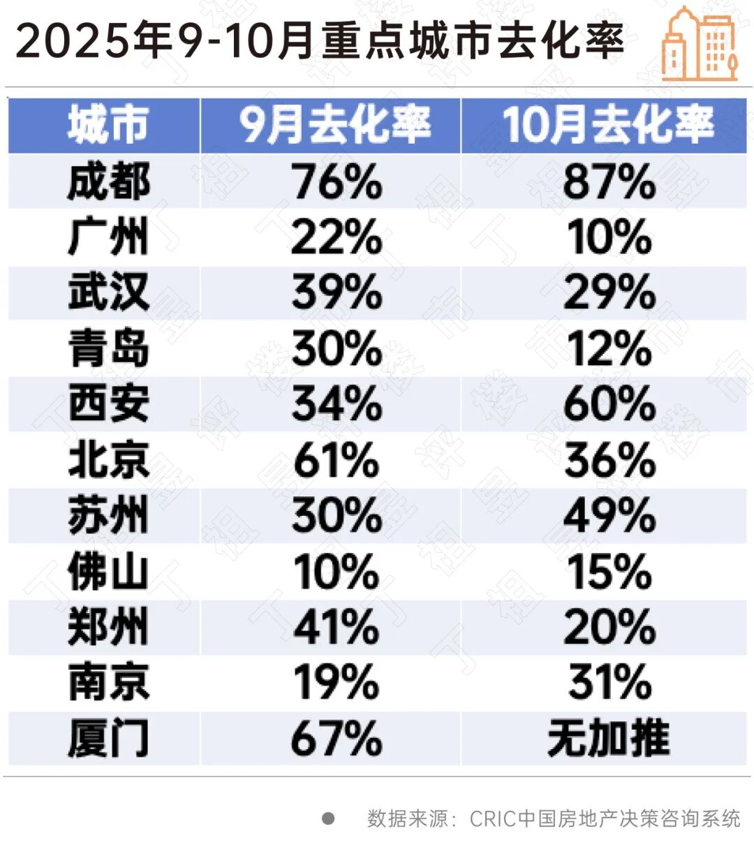 结合9月、10月去化情况来看,成交保持增长的城市大部分去化率都在10%以上,其中,成都、西安、北京、苏州、厦门去化率相对较高。