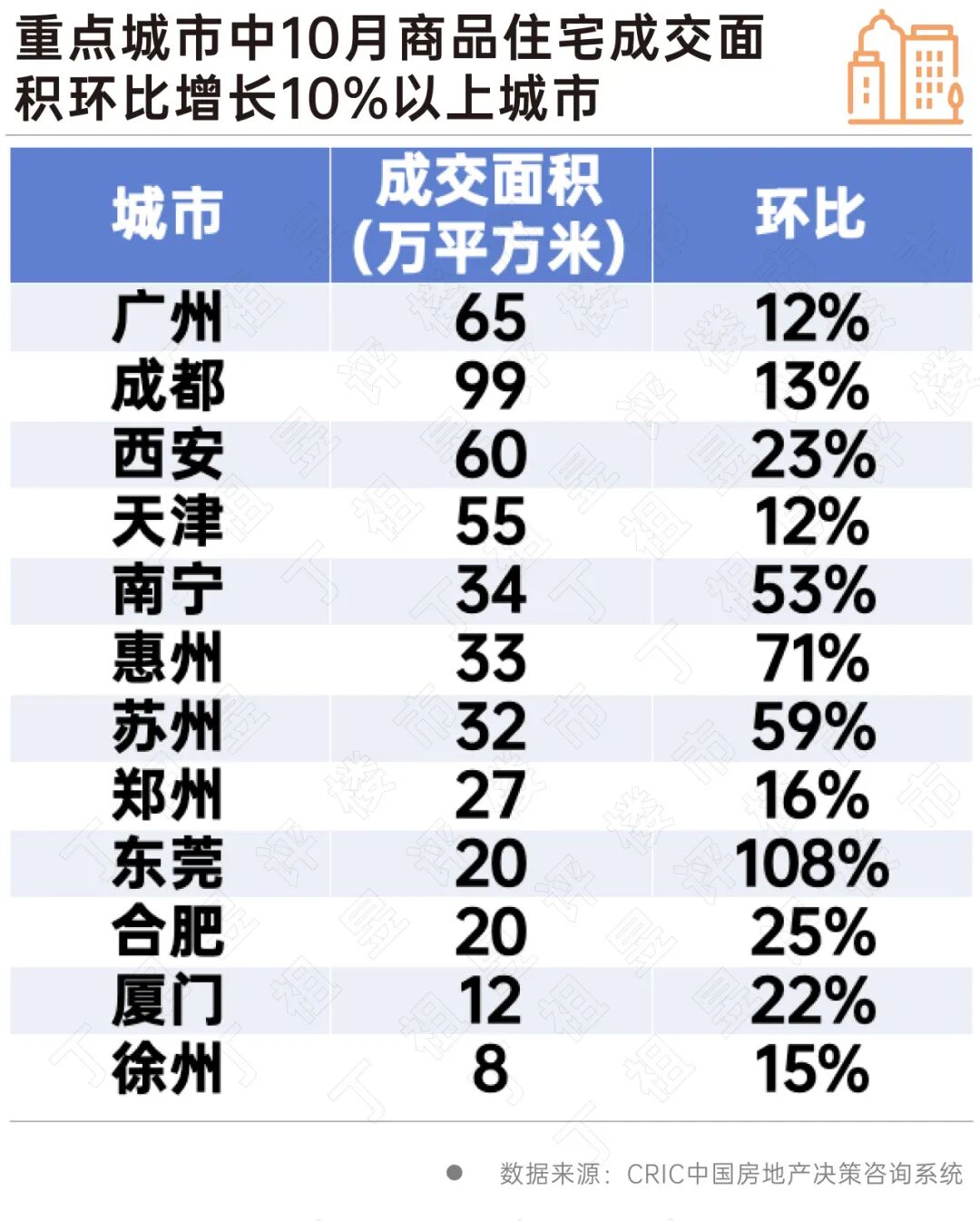 广州、成都、西安、天津、苏州等城市10月新房成交环比增长都在10%以上。