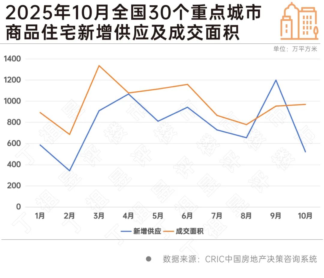 从2025年10月的供需情况来看,30个重点城市新增供应522万平方米,绝对量为年内次低,仅略高于2025年2月,包括一线城市和二三线热点城市在内的各个城市供应环比近乎“全线飘绿”。