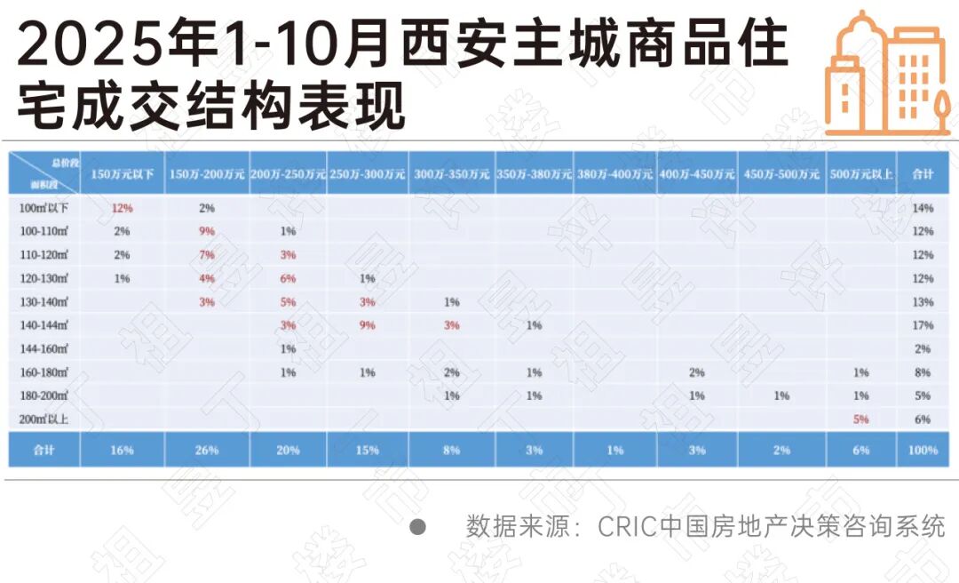 在成交结构上,总价200万以内的刚需刚改产品为西安市场成交主力,刚需刚改类四代宅在有效价差面前,产品优势被价格优势替代。同时,总价500万以上高改产品出现头部聚焦效应。