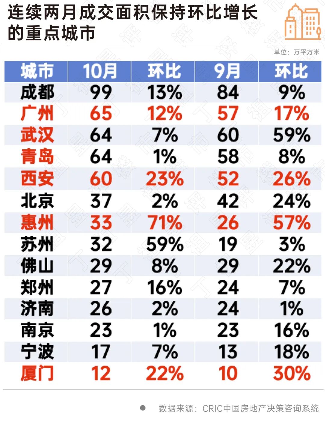 广州、厦门等连续两月成交环比增长10%以上