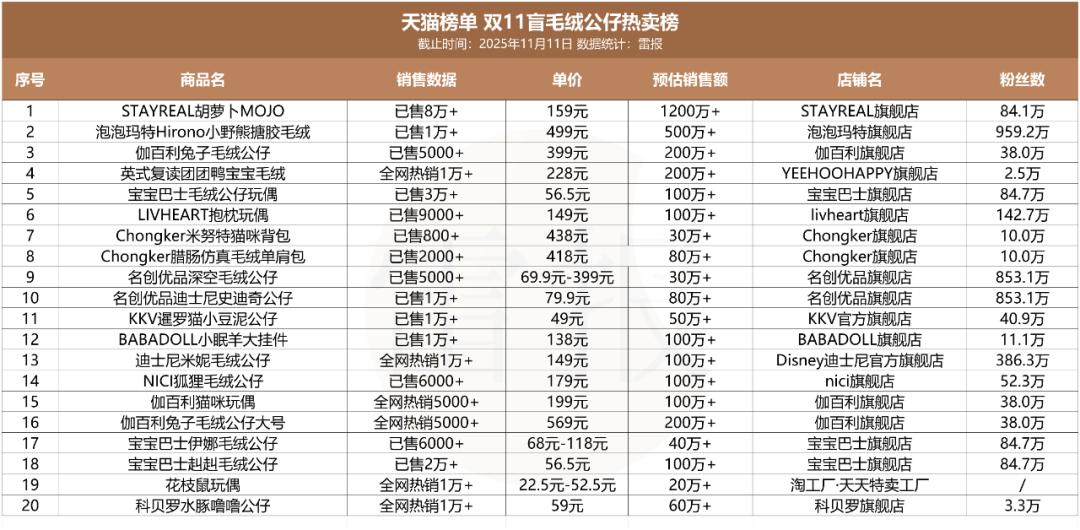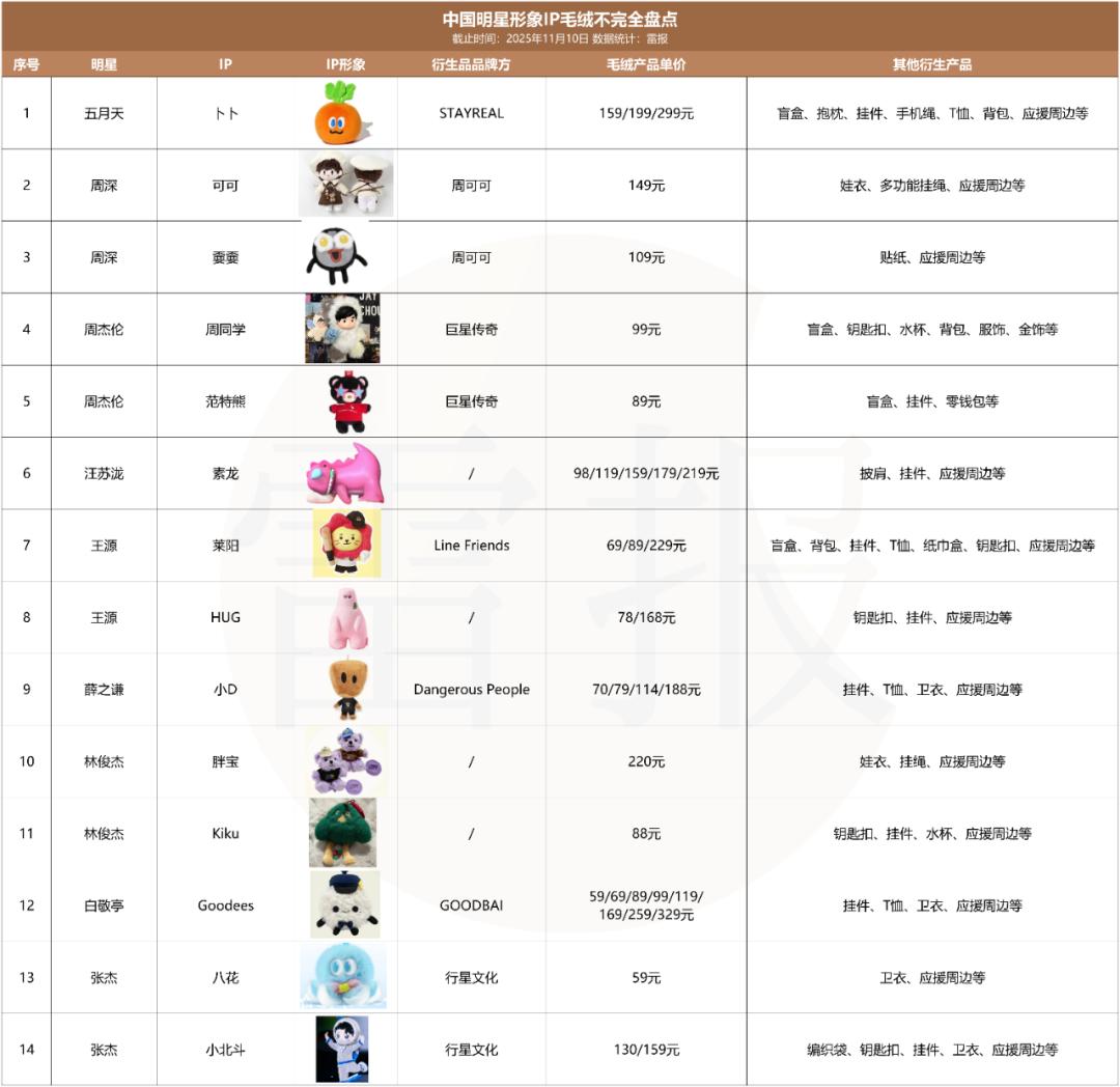 在竞争日益激烈的毛绒玩具市场,明星衍生IP正展现出惊人的商业潜力。据此,雷报不完全统计了目前市面上较受欢迎的明星IP毛绒产品: