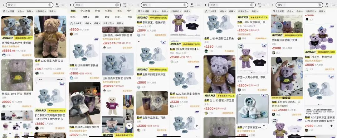 此外,还有张杰的独立音乐厂牌「行星文化」在北京朝阳大悦城举办快闪店,发售的周边商品引发粉丝排队抢购;林俊杰粉丝分享,明星的演唱会限定款“胖宝”毛绒在二手市场可溢价至上千元。种种案例共同证明,明星IP毛绒已形成完整的产业链条和消费市场。这些产品已超越简单的商品范畴,成为连接粉丝情感的核心纽带。