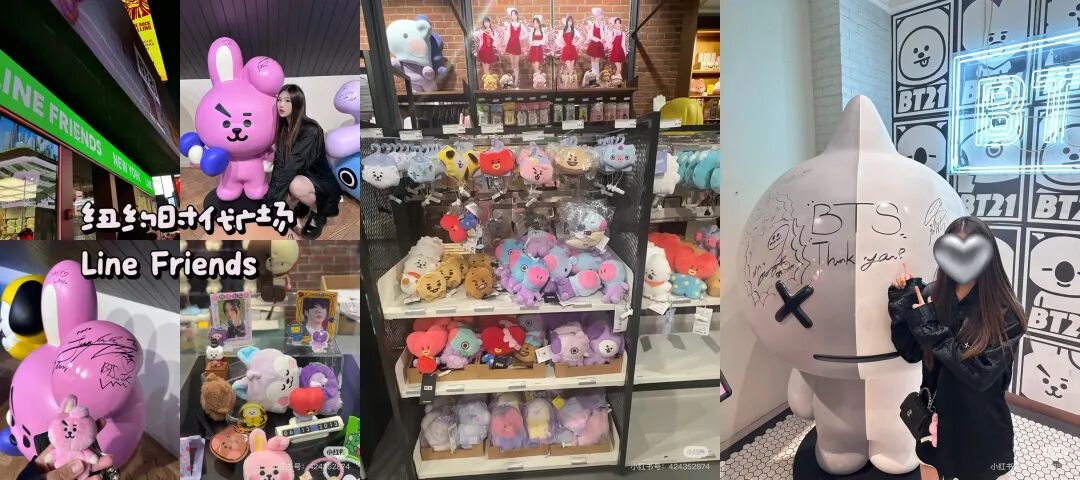 Line Friends与防弹少年团合作的BT21项目堪称典型。据悉,BT21是由防弹少年团(BTS)成员亲自参与设计创作的家族,不仅包括8个主要角色,还构建了完整的世界观。令人惊讶的是,BT21甚至超越了BTS本身的粉丝圈层,成为全球范围内的文化现象。在纽约时代广场的Line Friends旗舰店,随处可见非K-POP粉丝的年轻人为这些可爱形象买单。这种“破圈”能力的关键在于,BT21虽然起源于偶像,但通过强化角色个性与故事线,最终成为了具有独立生命力的IP。