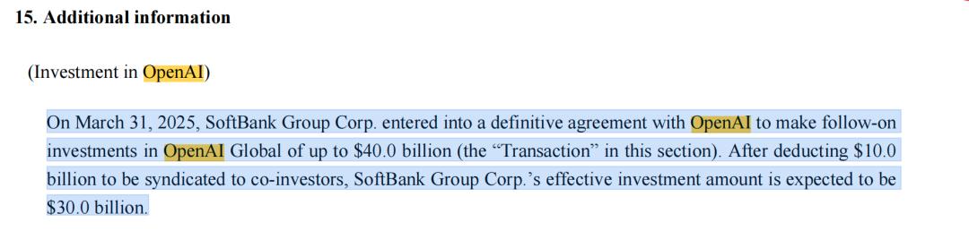 财报显示,软银集团在今年3月份,与OpenAI达成最终协议,对其追加实际投资金额300亿美元。而软银首席财务官后藤芳光在财报说明会上表示:“软银将在12月对OpenAI额外投资225亿美元。”