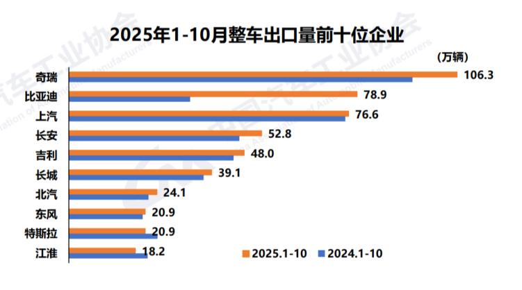 从企业排名看,奇瑞以106.3万辆的出口量位居榜首;比亚迪增速最为显著,出口78.9万辆,同比增长1.4倍,跃居亚军。