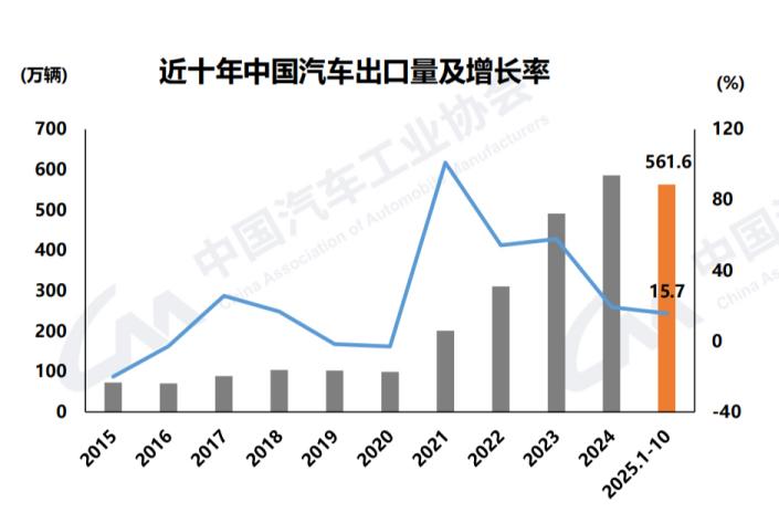 纵观前十个月,汽车行业结构性变化尤为显著。新能源汽车累计销量占比已逼近50%,与传统燃油车平分秋色。同时,汽车出口量连续三个月站上60万辆高位,前十个月累计总量达562万辆,已接近2024年全年水平。