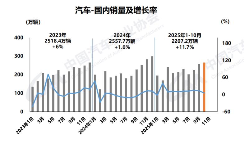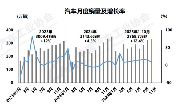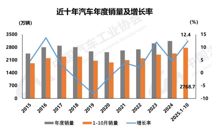 据中汽协统计,2025年10月,中国汽车产销分别完成335.9万辆和332.2万辆,环比增长超过2.5%,同比分别增长12.1%和8.8%。前十个月,中国汽车产销累计完成2769.2万辆和2768.7万辆,同比分别增长13.2%和12.4%。