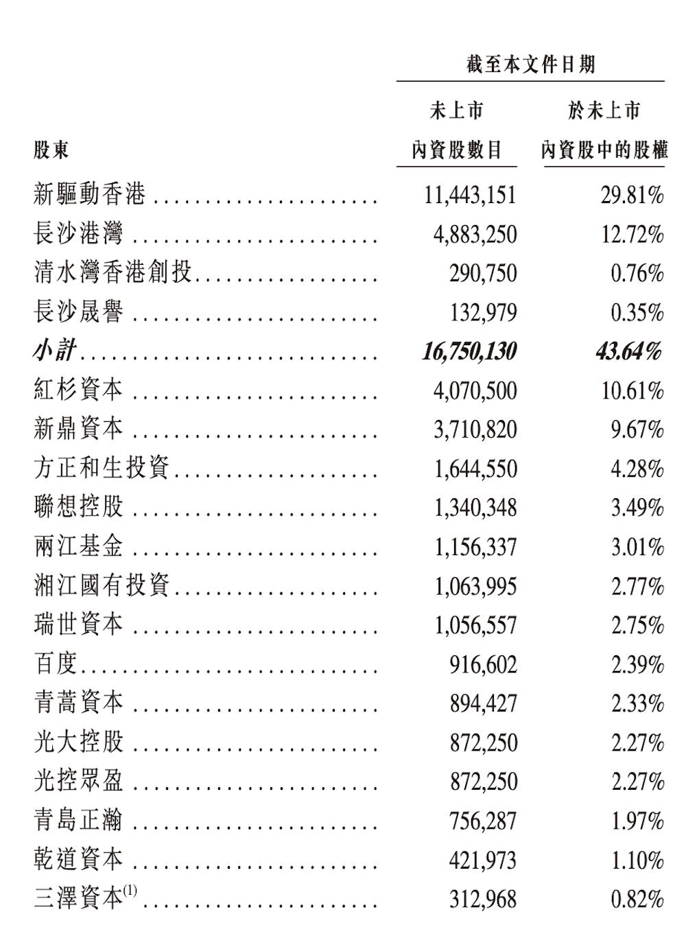 从最后实际可行日期的投资者股份构成来看,红杉资本持股为10.61%,新鼎资本持股为9.67%,方正和生投资持股为4.28%,持股为3.49%,两江基金持股为3.01%,湘江国有投资持股为2.77%,瑞世资本持股为2.75%,百度持股为2.39%,青蒿资本持股为2.33%,、光控众盈分别持股为2.27%。