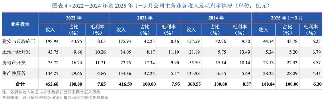 据了解,住总集团业务涉及建筑施工、土地一级开发、房地产开发和生产性服务等板块。2022-2024 年,公司主营业务收入持续下降。